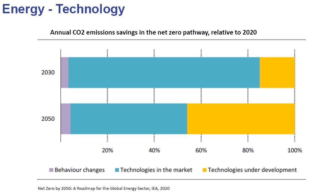Energy is highly tied to innovation and the research & development of new technologies. These facts are backed up with data and evidence and let me present you with a crucial fact: Around 50% of technologies needed to achieve the global annual CO2 emission targets in the net zero pathway by 2050 are technologies under development (i.e., still in university labs and/or still being researched!!).